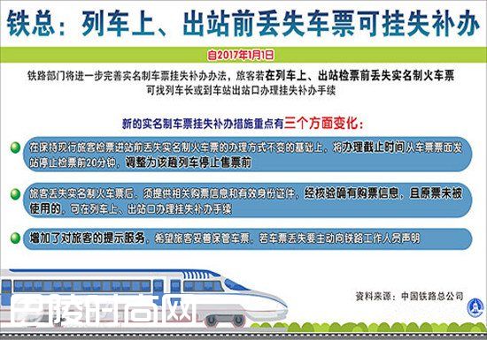 【政策】根据中国铁路总公司发布的消息,自2017年1月1日,铁路部门将进一步完善实名制车票挂失补办办法,旅客若在列车上、出站检票前丢失实名制火车票,可找列车长或到车站出站口办理挂失补办手续。