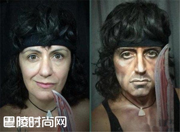 图中露西亚用化妆术把自己扮成《教父》中的马龙-白兰度。史泰龙也是她喜欢的影星,露西亚妆扮成电影《兰博》里史泰龙的样子。对比图看起来简直不可思议。注意完成后的作品上史泰龙有画出来的胸肌。