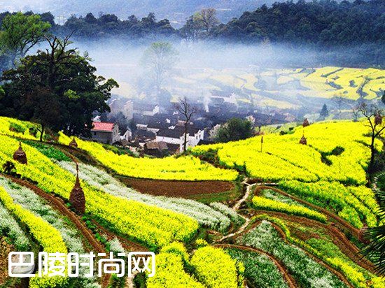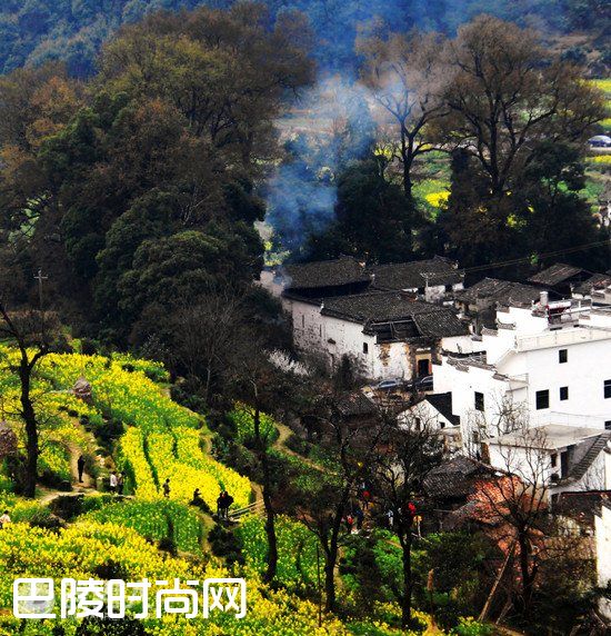 明清徽派古建筑依山傍水,飞檐翘角,粉墙黛瓦,掩映在青山绿水油菜花丛中,宛若置身于一幅清丽的山水画中。