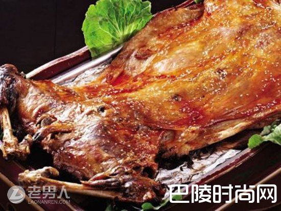 处理好的羊腹内放入葱段、姜片、花椒、大料、小茴香末,并用精盐搓擦入味,羊腿内侧的刀口处,用调料和盐入味,刷上酱油、糖色略凉,再刷上香油。挂入热烤炉,将炉口盖严,大约3~4小时取出。