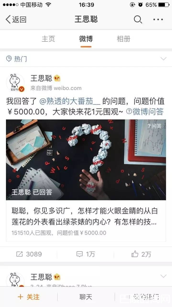 3月25号,王思聪参与了一个问答活动,其中一条价值5000元的提问,引起一众网友围观。