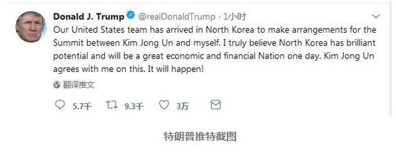 他在推特中说道:“我美国的工作组已经抵达朝鲜,以筹备我与金正恩之间的峰会。真心相信朝鲜拥有巨大潜力,有朝一日会成为一个拥有伟大经济和财政的国家。金正恩也同意我的想法。这一切会发生的!”