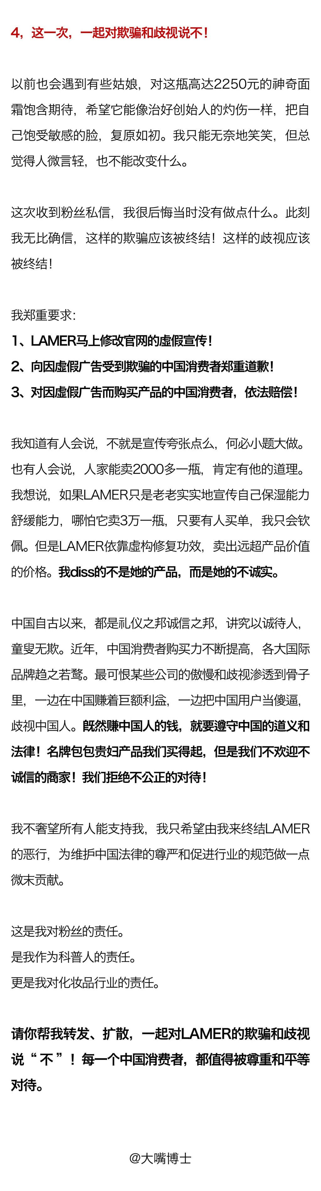 知名美妆博主大嘴博士 26日发表微博,认为LAMER虚假宣传并不存在的修覆疤痕功效,欺骗大陆消费者购买,并在微博PO出民事诉讼状照片,截至目前为止,已有近9万人分享。LAMER海蓝之谜 微博涌入大批愤怒的网友(见下图,取自海蓝之谜微博),lamer欺骗中国消费者一度成为微博热搜话题,阅读量也超过5600万。