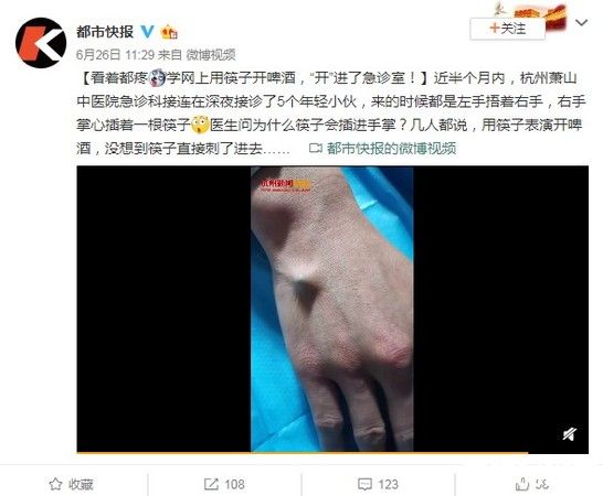 浙江省杭州市萧山中医院急诊科半个月内共接诊5名手插筷子的年轻人,手足显微外科主治医师熊振飞解释,自己接诊过其中3个病例,他们都是20多岁的年轻人,晚上一群人去吃饭喝酒,过程中为了耍帅表演用筷子开啤酒,结果一掌拍下去,筷子戳进手心,连手背都凸起一座小山丘。