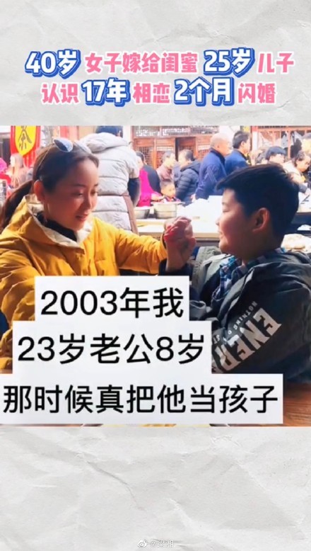 大陆微博近日热门讨论,一名40岁的女子和25岁的年下男结婚,特别的是,女子和男方的妈妈认识17年,做了15年的闺蜜,换句话说女子等于是看着老公长大的,两人在2003年留下一张合照,照片中的她23岁,男方才8岁,那时候她把对方当成一个孩子,没想到17年后,两人却成了夫妻。