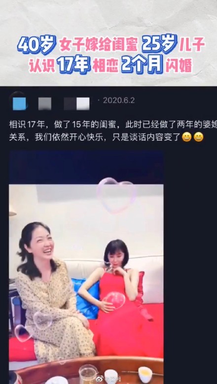 据传两人交往2个月便闪婚,结婚至今已经2年,女子和好姐妹虽然从闺蜜变成婆媳关系,但是双方相处依然开心快乐,变得只是谈话的内容和以前不太一样了。