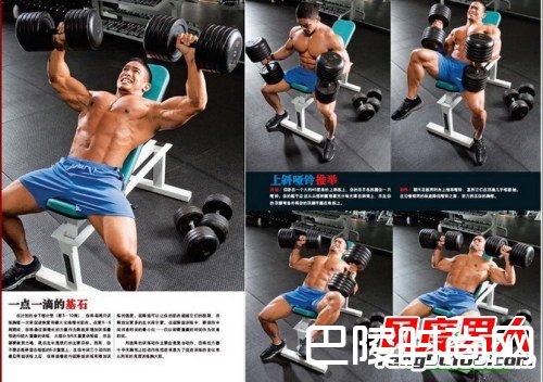 锻炼上部胸大肌。哑铃比杠铃的好处就是没有横杠限制,可以充分拉伸胸大肌,注意不要往下放的太低,以免拉伤胸肌。这个练习放在前面做,因为自由重量需要花很大精力。斜板的角度控制在30-45度之间,角度太大对三角肌前束的压力也越大,会影响到胸肌的发力。