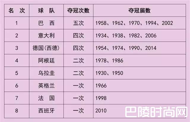 世界杯夺冠次数排行榜
