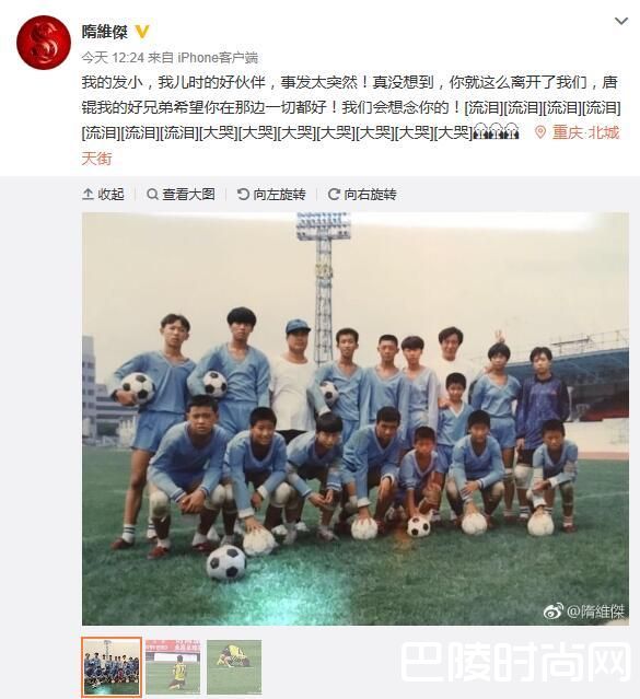 重庆斯威门将隋维杰写道:我的发小,我儿时的好伙伴,事发太突然!真没想到,你就这么离开了我,唐锟我的好兄弟希望你在那边一切都好!我会想念你的!