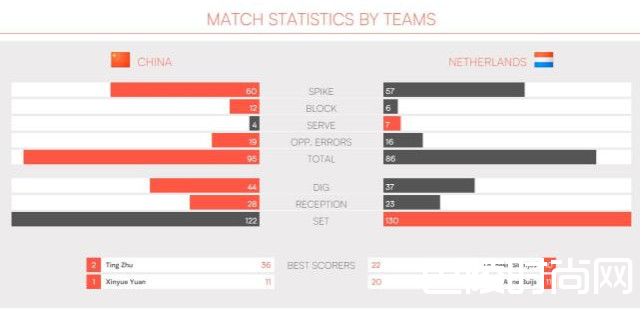 中国队除了朱婷36分之外,袁心玥和龚翔宇分别拿到11分和10分,荷兰队的斯洛特耶斯拿到22分,为本队最高,主攻布伊吉斯砍下20分,副攻贝丽恩得到10分。