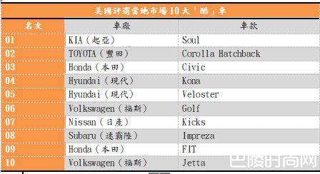 除了南韩车厂,本次入选酷车Top.10的车款,也有不少在美国消费者颇具口碑的日系品牌;除了以初生之犊不畏虎之姿抢进市场的TOYOTA Corolla Hatchback(即台湾市售Auris)外,诸如Honda Civic、FIT、速霸陆Impreza、Nissan Kicks等日系劲旅,皆以相当优异的产品CP值,获得Kelley Blue Book 肯定。