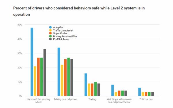 受测驾驶普遍认为Autopilot(特斯拉)安全性最高,且有48%驾驶认为将手移开方向盘是安全行为。当Autopilot自驾辅助系统启用时,34%驾驶认为行车中讲电话没有安全疑虑,16%驾驶认为行驶中打字传讯息没有问题,8%驾驶认为同时看电影或影片不影响行车安全,最夸张的是,有6%驾驶认为此时打瞌睡是安全的行为。