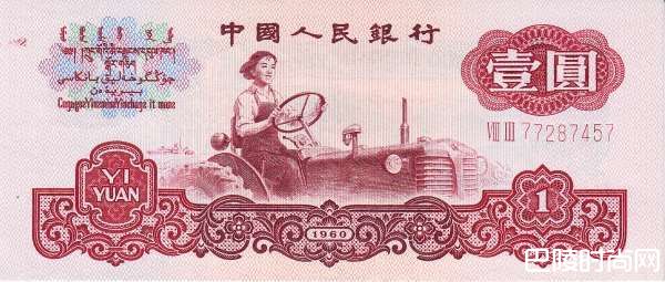 1960年1元人民币发行于我国的三年经济特困时期,流通时间有40年之久,纪念着我国那个时期的社会经济情况,具有历史意义和纪念意义。从1960年1元人民币的设计细节来看,采用了机器和传统的手工相结合,图案花纹显得更加精细,油墨配色比较合理,色彩新颖明快;票面纸幅也相对小很多。而在防伪功能方面,1960年1元人民币上令人难忘的是一位女拖拉机手的形象,她的气质极具当时的时代特点——英气、干练、胸怀大志,这套人民币是1962年4月印制的,2000年7月1日停止流通。