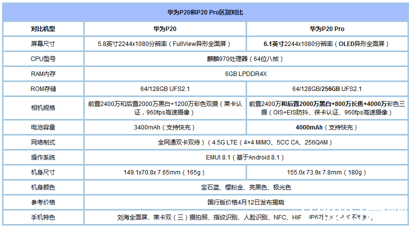 P20、P20 Pro系列拥有不俗的外观设计,强悍的拍摄性能,因此备受国内用户期待。那么华为P20 / P20 Pro除了价格之外两者的配置方面的主要区别在哪呢?