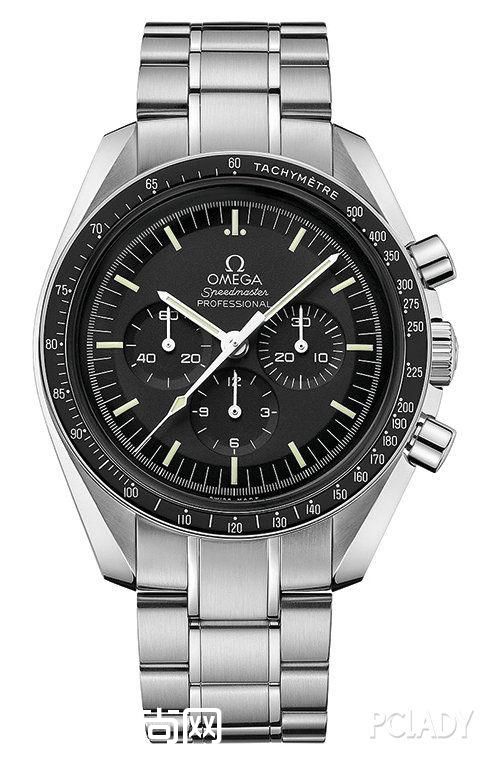 欧米茄超霸专业“月球表”配备黑色表盘,设有小秒针表盘、30分钟计时小表盘、12小时计时小表盘及中央计时指针,并覆有耐磨损蓝宝石表镜。42毫米精钢表壳配备带有测速刻度的黑色表圈,搭配同材质表链。