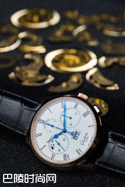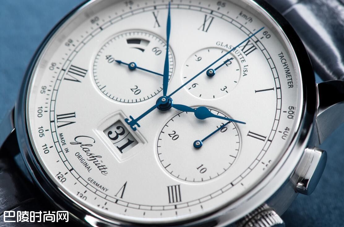 同时采用格拉苏蒂原创议员系列经典而时尚的和谐对称设计。表盘在12点的位置放置典雅的计时盘,而由象牙白背景映衬黑色数字的大日历显示置于表盘下半部分的中央。9点钟位置是带有黑白动力存储显示的小秒盘,而3点钟位置则是30分钟计时器。纤细雅致的表圈围绕着表盘及蓝钢指针。