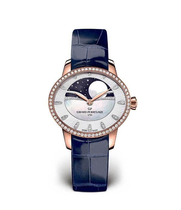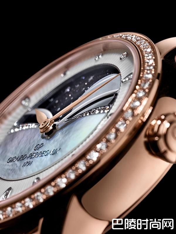 标志性的猫眼表壳,为点点星光提供了舞台,其华丽的椭圆形外观充满活力,极具魅力,轻柔地贴合手腕的弧度,使它看上去像一颗真正的宝石。表壳采用玫瑰金制成并镶有62颗明亮式切割钻石,与玑镂雕刻装饰的珍珠母贝表盘浪漫辉映。表盘缀以玑镂纹饰以及水滴状的钻石刻度,将目光引入宽8.9毫米直径、在59天内完成旋转的月相显示圆盘。相较一般的月相显示,其驱动这种复杂性的月相显示装置不与小时轮的轴心所连接,而是与发条盒链接,使其能够不带任何震颤地中平稳移动。
