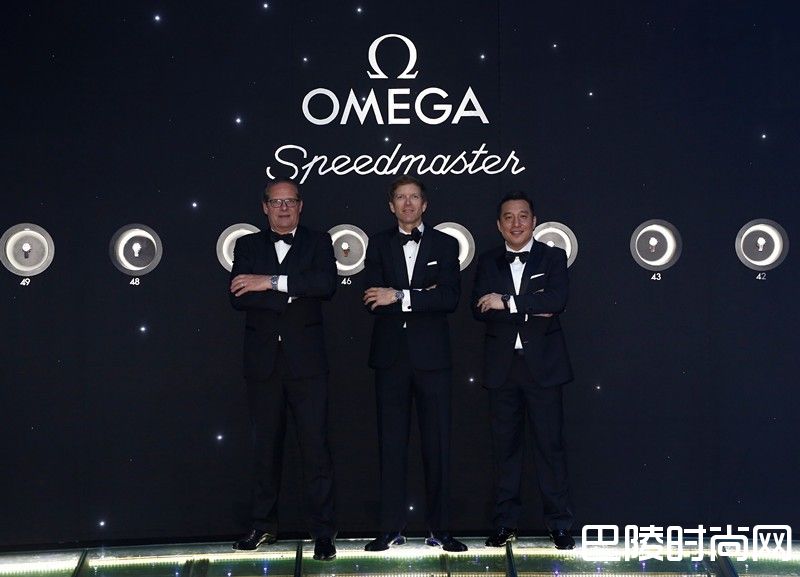 (左起) 欧米茄产品开发与客服副总裁莫纳尚先生(Mr.Jean-Claude Monachon)、欧米茄市场副总裁贝哲培先生(Mr.Jean-Pascal Perret)以及欧米茄中国区副总裁杨骅先生于欧米茄超霸系列60周年纪念派对上合影