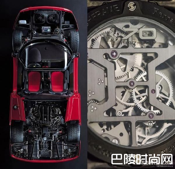 透过蓝宝石玻璃,在背面12点位置可以看到一个低调的法拉利标志和“70,1947-2017”字样,这样不摆在明面上炫耀,而是暗中装×的设计,也很说明了设计师的品味。