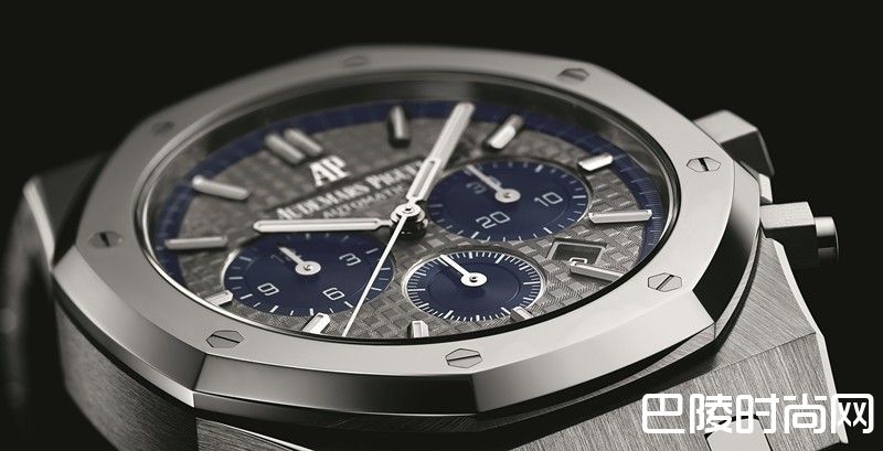 表盘深灰色表盘,镌刻“Grande Tapisserie”大格纹装饰,蓝色副表盘,搭配白金材质荧光立体时标和皇家橡树指针