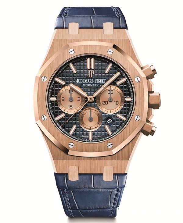 表带蓝色手工缝制鳄鱼皮表带搭配18K玫瑰金AP字样折叠表扣
