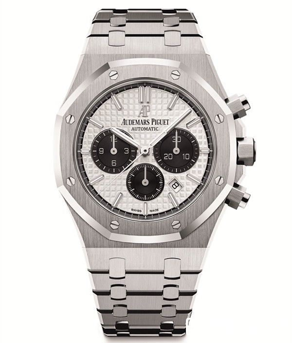 表盘黑色表盘,镌刻“Grande Tapisserie”大格纹装饰,银色副表盘,搭配白金材质荧光立体时标和皇家橡树指针