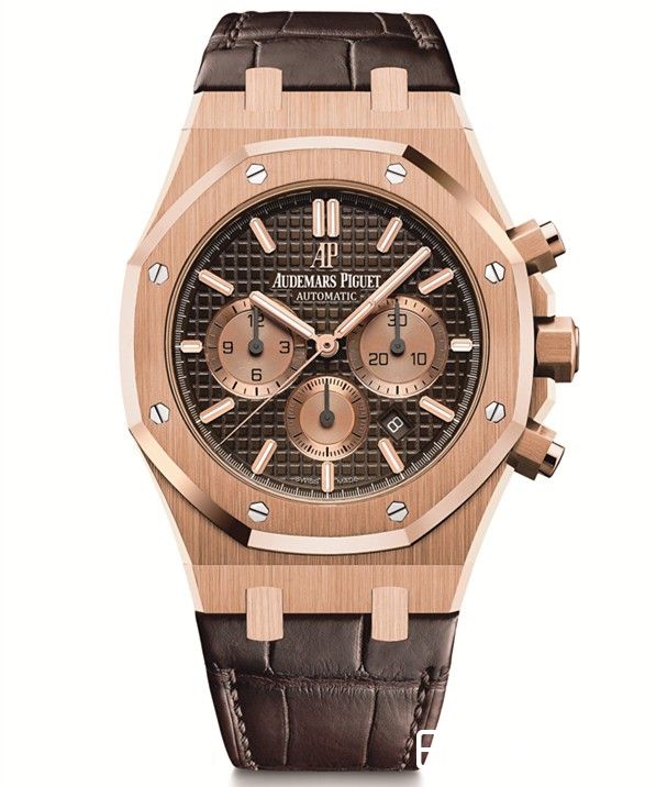 表盘棕色表盘,镌刻“Grande Tapisserie”大格纹装饰,玫瑰金色副表盘,搭配玫瑰金材质荧光立体时标和皇家橡树指针
