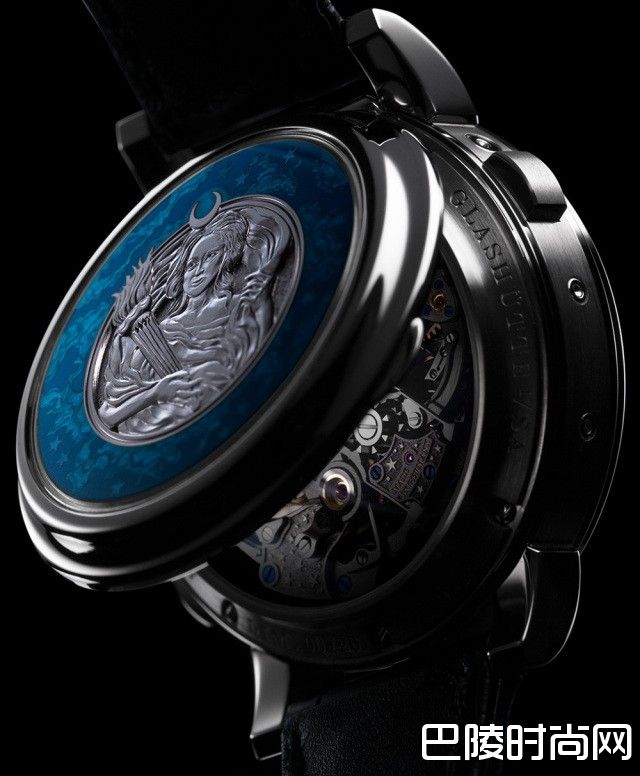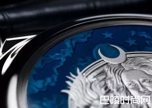 在观赏机芯之前会先欣赏背盖上的月亮女神,朗格用浮雕的技巧在背盖上刻画出女神手拿火炬及飘渺面纱的动作,那些将发丝、火焰、脸部表情都非常深刻,外圈同样采用珐琅和浮雕星星、云朵相结合的工艺。
