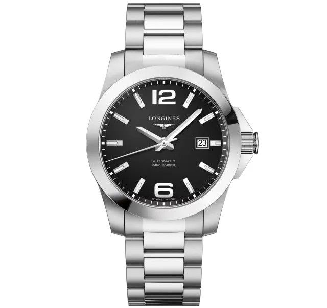 这枚腕表表径41mm,精钢材质表壳镶嵌抗磨损合成蓝宝石表镜,内侧带多层防反光涂层,耐刮防腐蚀性强。黑色漆面抛光表盘镶嵌阿位伯数字和时标,搭配镀银抛光指针,3点位置设有日期显示窗口。