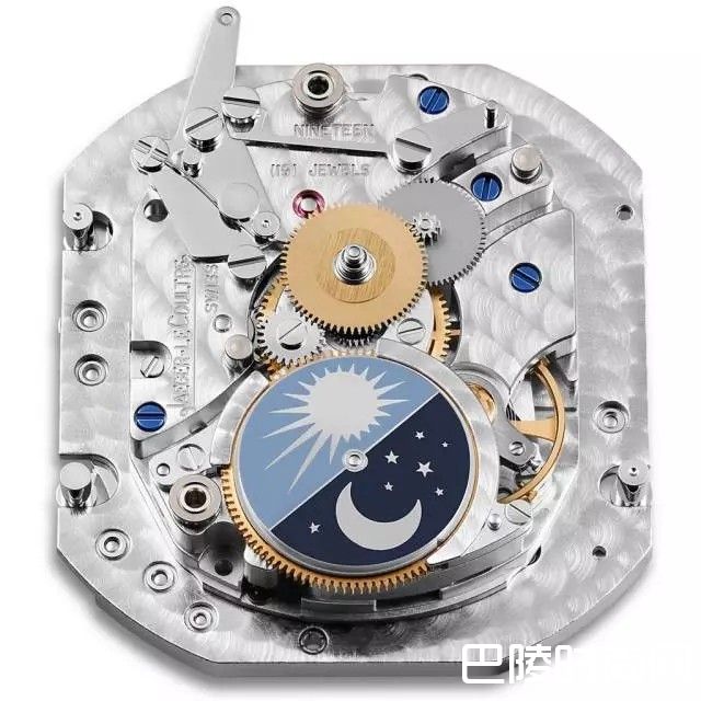 表径49.7×29.9mm,厚10.9mm,精钢表壳。正面银色粒纹表盘,搭配蓝色手工镶贴时标格外引人注目。深邃的蓝色背面表盘四周饰有巴黎钉头饰纹,表盘中央则采用乳白色细节装饰设计,昼/夜显示呈现日月交替。