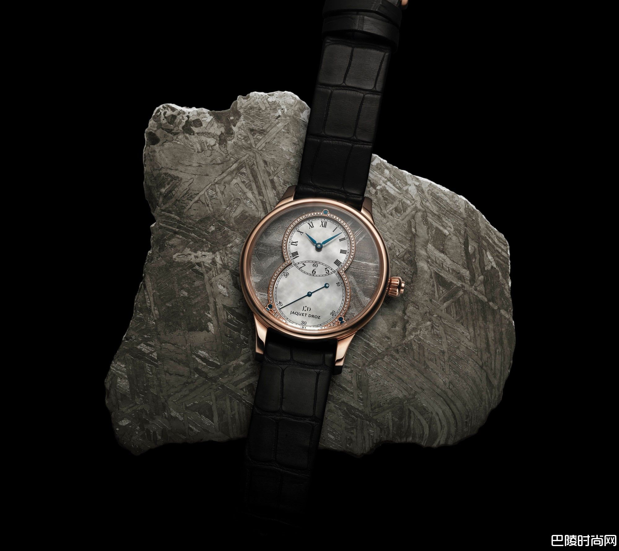 雅克德罗陨石日期显示大时分针腕表(Grande Heure Minute Quantieme Meteorite)采用极简设计,以天然陨石表盘与红金刻度彰显尊贵品味,日期显示功能增添日常实用度;陨石日期显示大秒针腕表(Grande Seconde Quantieme Meteorite)将品牌标志性的数字8形融入到表盘制作中,在神秘感之上增添吉祥好运;陨石大秒针腕表(Grande Seconde Meteorite)以白色珍珠母贝针盘镶嵌于陨石表盘之上更显奢华,富有质感的蓝钢指针与镶钻表缘将雅克德罗精美品质展露无疑。陨石系列腕表均限量发行88枚,每一款表盘都拥有独一无二的纹路,可谓世间独一无二,是独属于拥有者的特殊身份识别标志。