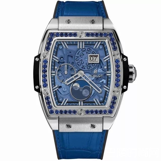 腕表表径45mm,厚13.8mm,酒桶型钛合金表壳采用抛光、缎面拉丝等工艺处理,表圈镶嵌48枚蓝色蓝宝石。蓝色石英表盘配以双针,中央指针指示小时和分钟,9点钟位置设有独立小秒针,12点钟和3点钟位置之间设有大日历显示,6点钟位置为月相盘。