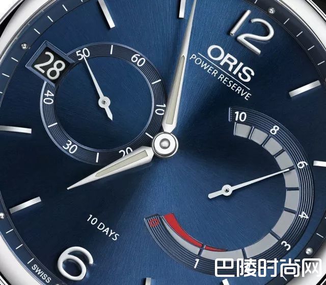 腕表在外观上有鲜明的视觉特征,表盘左侧是小秒针盘与日历显示,右侧则是10天长动力动储显示。