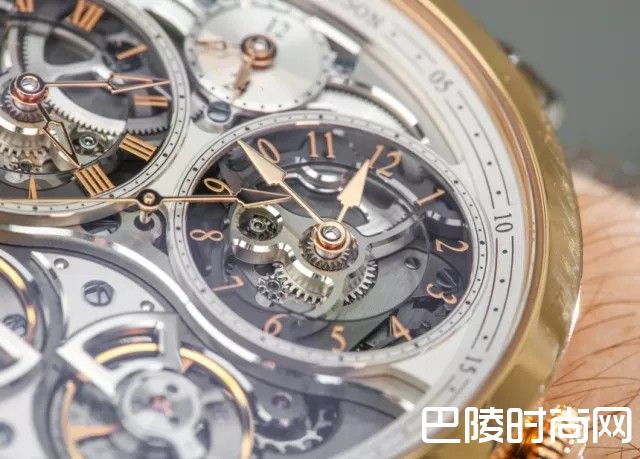 腕表设有两个不同的时间显示,每一个时间显示均以独立的发条盒及齿轮传动链、擒纵机制和摆轮操控。