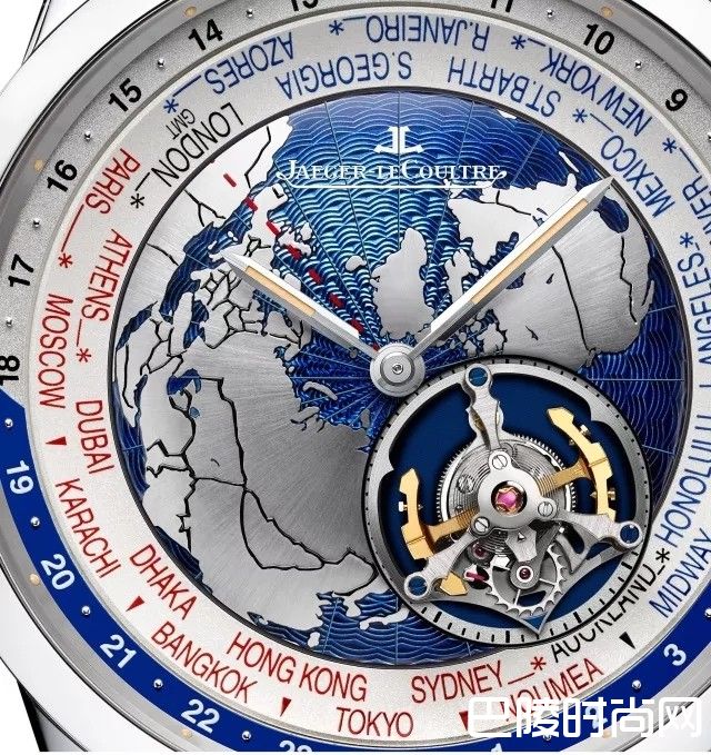 表盘中心是一幅世界地图,视角为北极点正上空,深蓝色漆面饰有细小的波纹图案;表盘外围配备世界时区标盘和世界城市时区内环,可以读取世界各地的时间,简单方便;表盘的陀飞轮还可以自转,围绕表盘中心公转,每24小时转动一圈,其中陀飞轮内的摆轮用的是积家专利的Gyrolab摆轮。