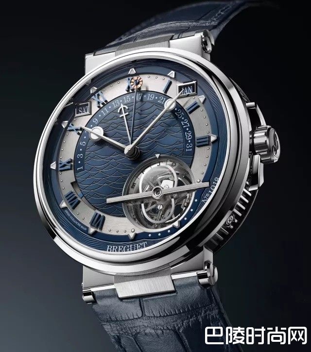 从正面看,古典罗马数字并装饰发光圆点小时刻度,与覆有发光材料的金质宝玑开口针相互映衬,时间指示明显而直观。另有雕刻金质太阳的太阳指针,以及上方的星期、月份、年份视窗、中央逆跳日期指示窗和8点方向的动储显示窗组成。