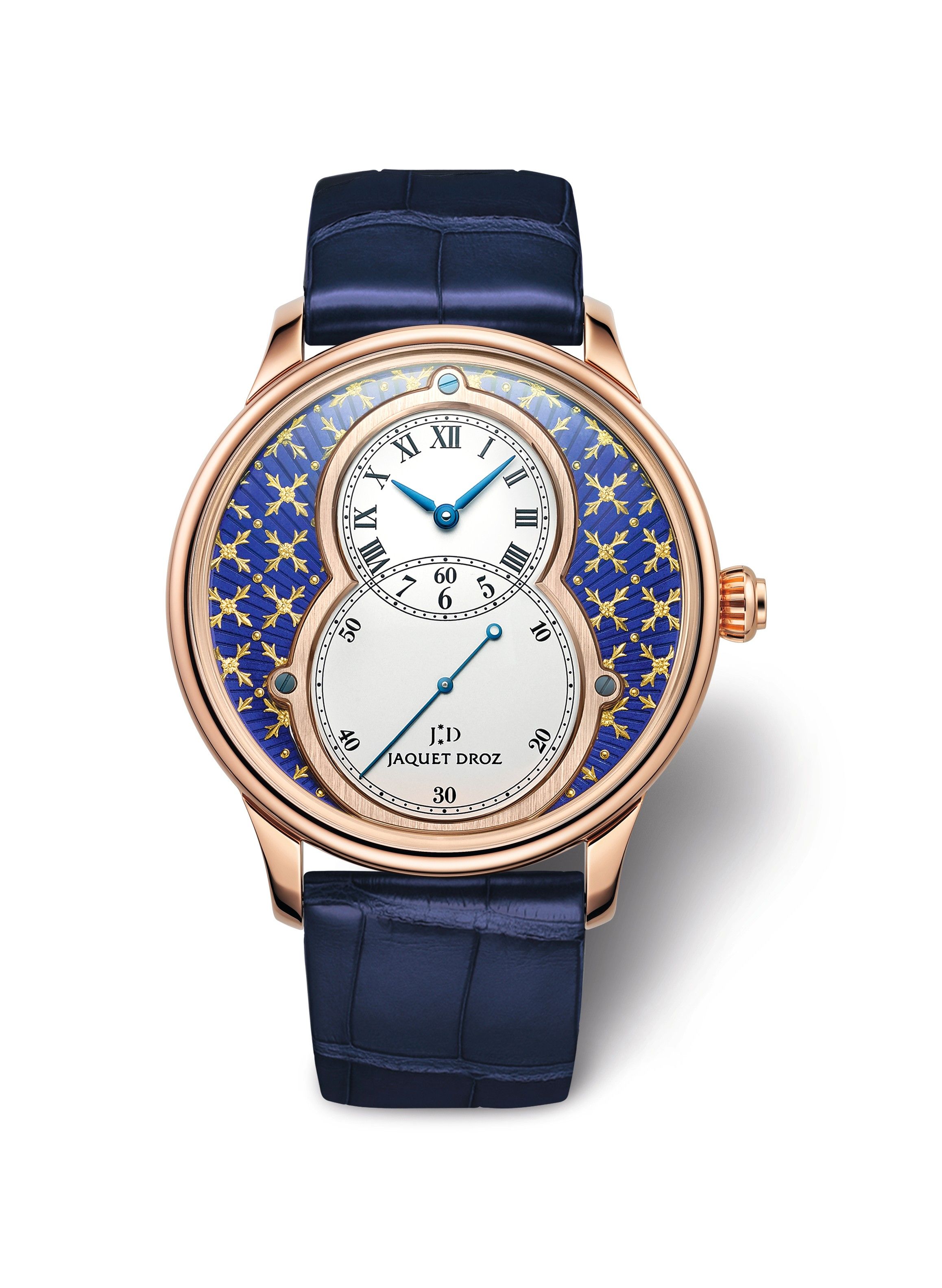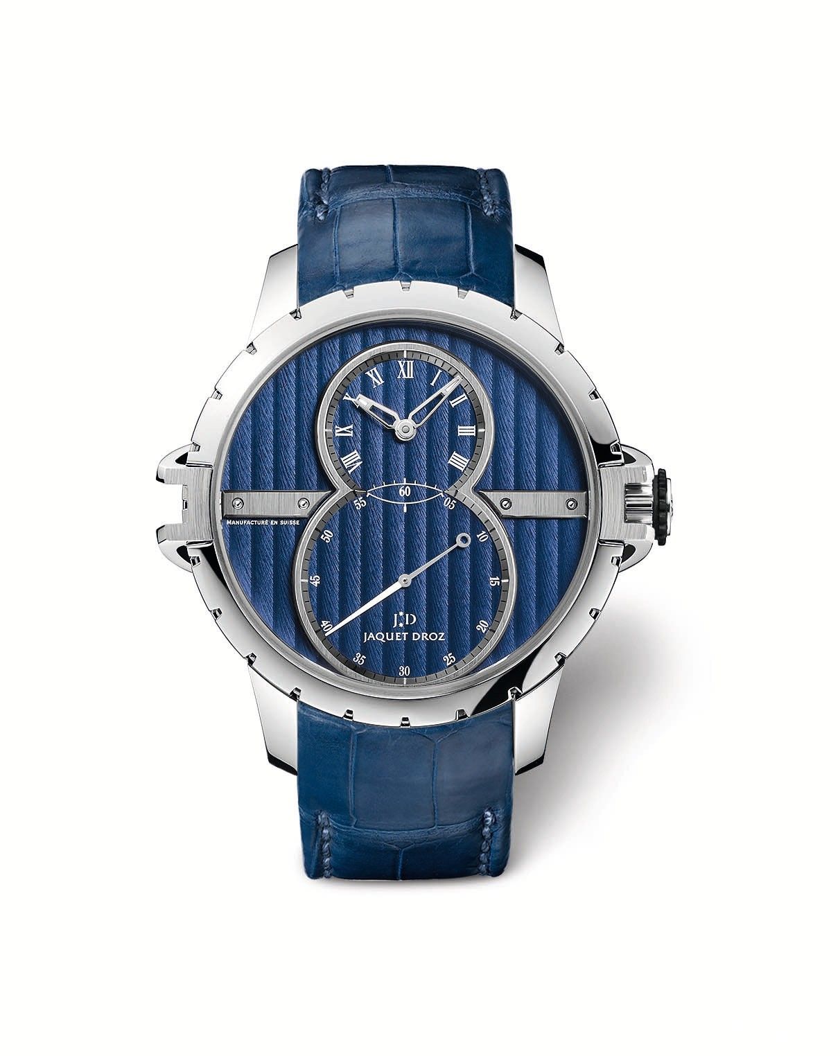 张晓谦佩戴雅克德罗蓝色款精钢大秒针运动腕表(Grande Seconde SW Steel)