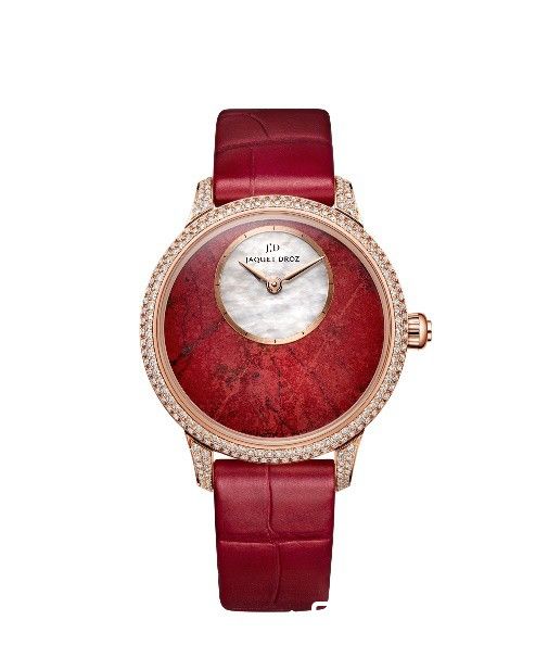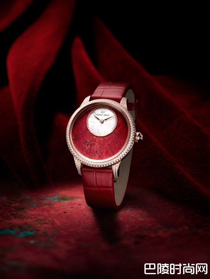 雅克德罗(Jaquet Droz)使用富含氧化铜的墨西哥“Sonora sunrise”赤铜矿,并精心挑选色泽鲜丽的矿石碎片,引人遐想联翩:表盘宛若一片红色星球,将宇宙天体的梦幻魔力与鲜红色调的热烈激情融为一体。