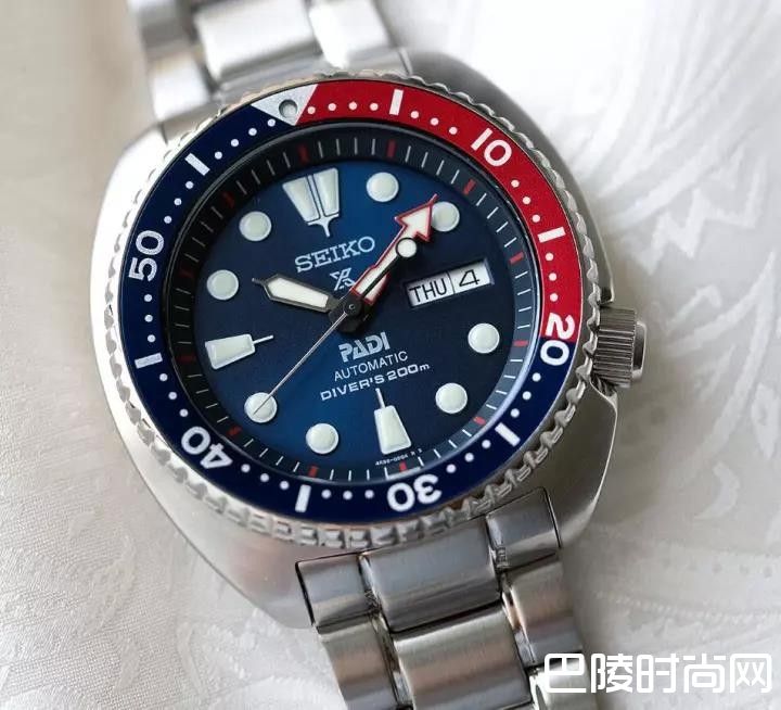 乌龟有一系列哑光,可能有点单调的颜色可选,包括经典黑色款型(SRP777K1),PADI版的比较活泼。不同于多数精工潜水表的扁平或半光的表盘,PADI乌龟采用的是太阳光线拉丝蓝色金属表盘,颜色随着光线的变化而改变。