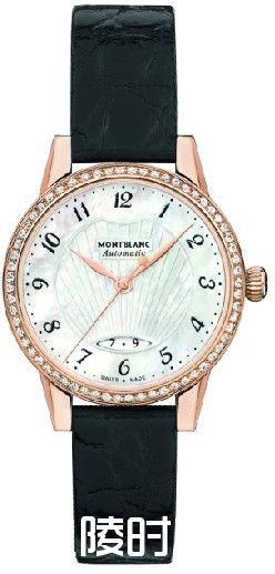 万宝龙宝曦系列日历自动上链腕表搭配黑色鳄鱼皮表带和18K玫瑰金针扣。