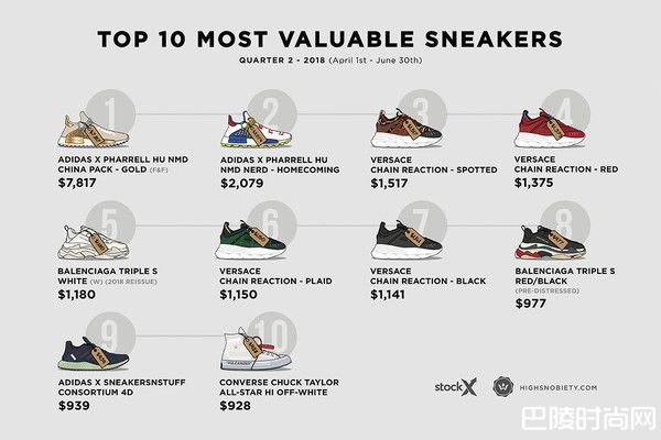 2018年第二季价值最高的10双球鞋中,以Adidas x Pharrell Williams Hu NMD的快乐配色拿下第一名,炒价为美金7,817元,之所以有如此昂贵的天价,是因为它全球限量300双,且为亲友限定版本,想买都不一定买得到。
