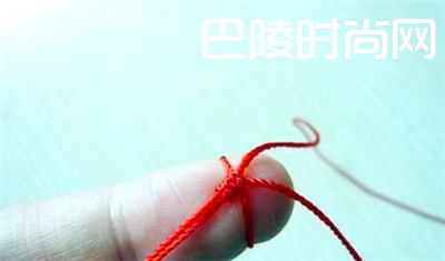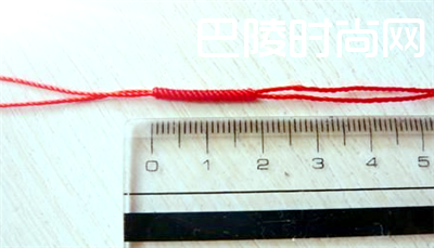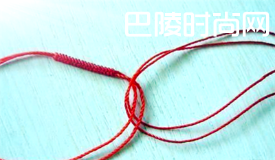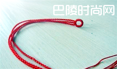 5.取另两根红绳,居中套在金刚结的甩线上。