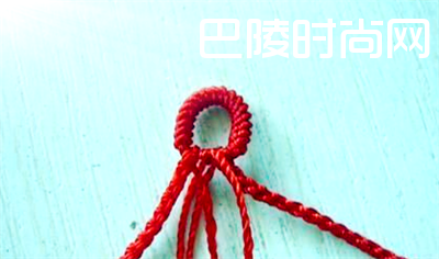 8.同样的方法,将最后两根红绳在金刚结另一边套好,编四股辫。