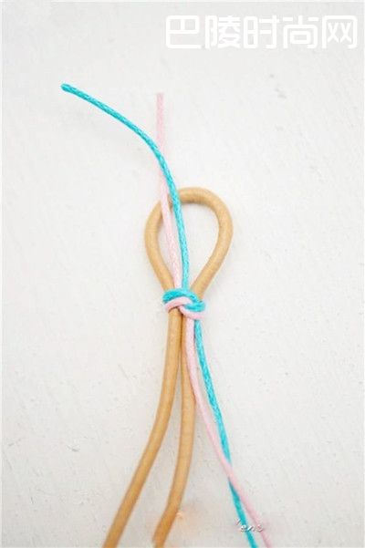 步骤二:我先把皮绳折成两半,然后取出蓝色以及粉色两根绳子,在皮绳上打个结,皮绳必须留出一个开口。