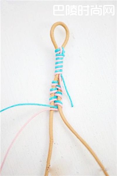步骤三:接着把刚刚打了结的绳子的一头用其他绳子缠住,接着把蓝色跟粉色的两根绳子一上一下的绕着两根褐色皮绳缠绕。