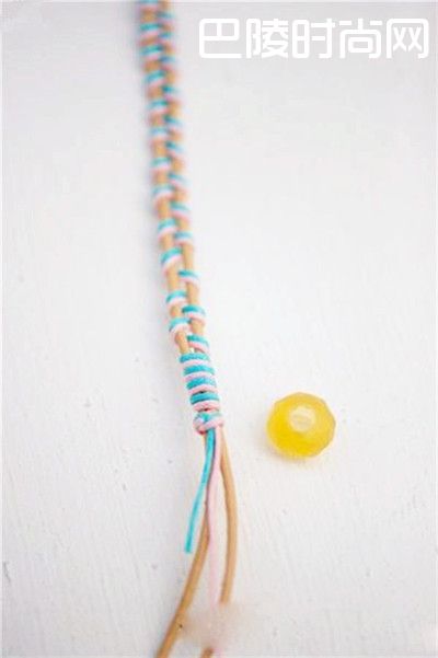 步骤四:缠到一定长度,我把蓝色跟粉色绳子像开始缠绕一样在皮绳上缠绕几圈,然后打结。