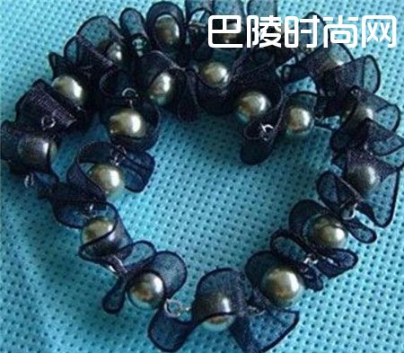 第二步,取1CM宽的黑色丝带,8MM的仿珍珠。把珍珠项链分散出来,弄出一个个独自分开。针线把布给收缩起来。把珍珠间隔地在布之间连起来,如图。