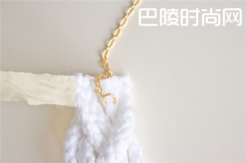 第二步:修剪末端的胶带长大约为1/2″ 。打开其中一端。把扣环穿过其中一条棉绳,并粘上强力胶,这样棉绳就不会拆散了。接着装上7”长的链条。再次用胶带紧紧地缠绕好棉绳末端。在另一端重复上述步骤。