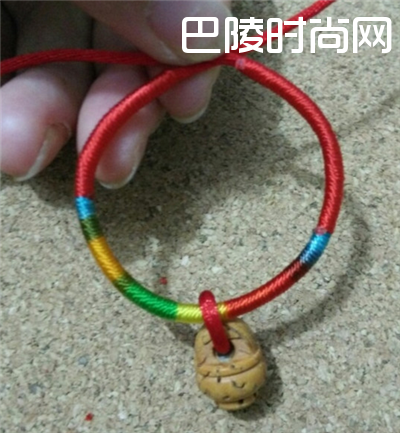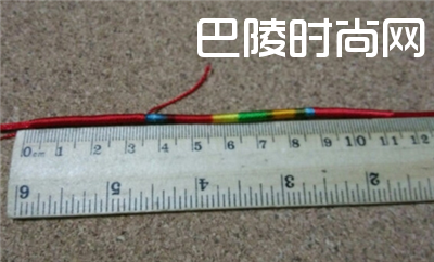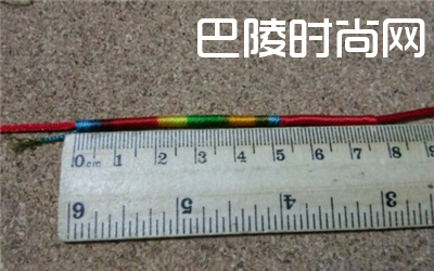 4、然后再取一根1米左右的五彩线,用刚才缠绕的方式继续缠,如图,这是五彩线缠好的效果,我配的是中间五彩,两边大红的,下面仍然是缠大红色的线,一共11.5cm,整体缠好后,先放一边。
