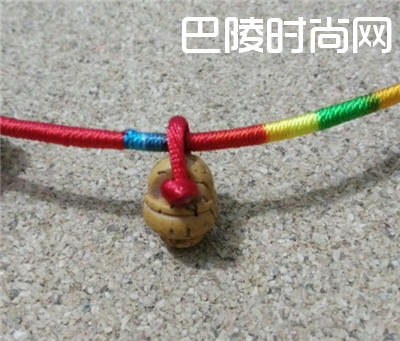 9、将主线两头交叉,取一根五彩线用平结固定,这是图解